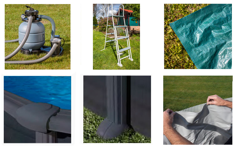 Escada: Escada de segurança com plataforma. É de aço galvanizado e lacado em branco com 6 degraus, plataforma superior e com frontal extraível. (Permite desmontar os degraus do lado exterior para impedir o acesso das crianças à piscina e prevenir acidentes).